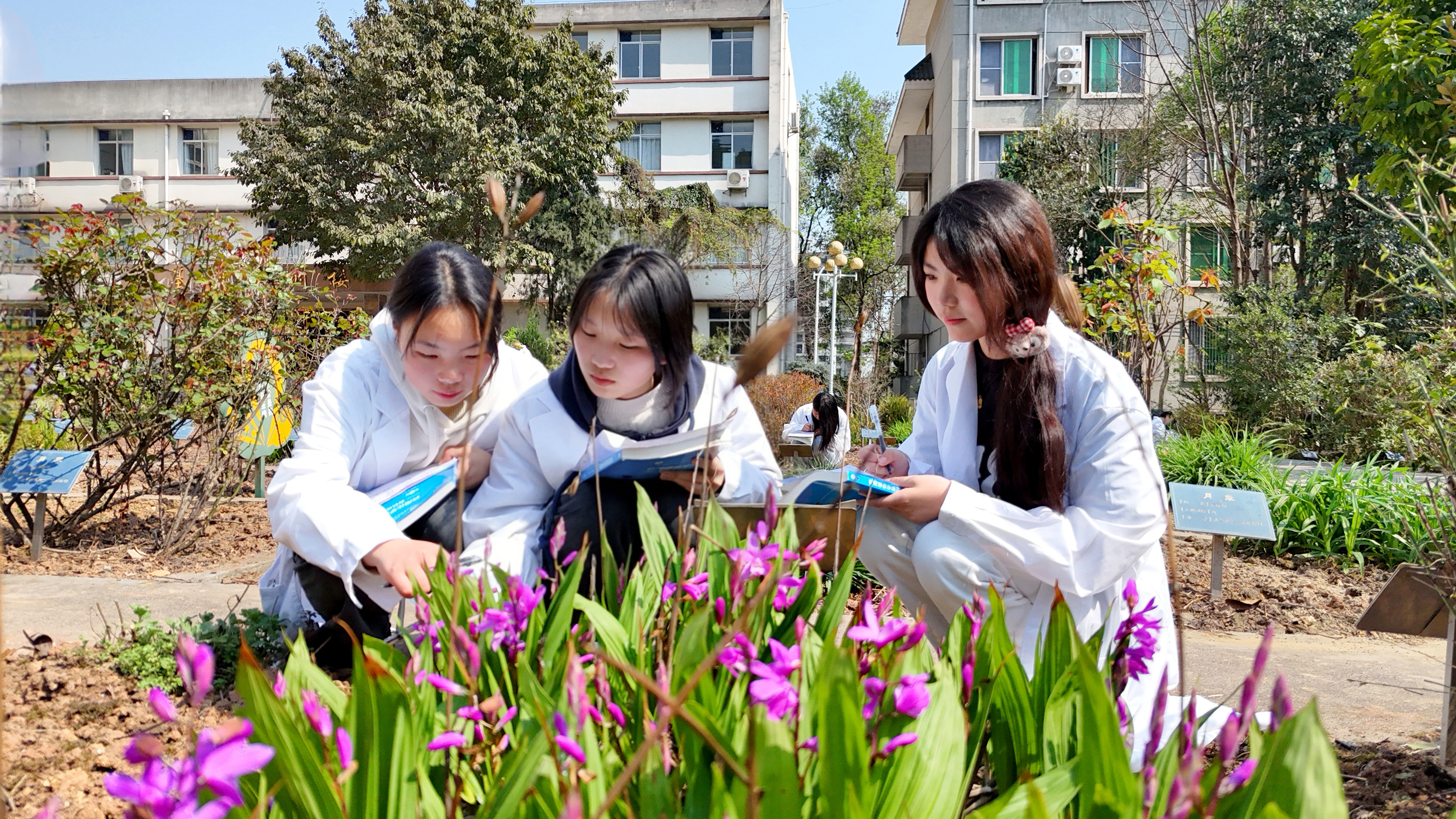 当第一缕东风拂过钟楼的秒针,樱花树枝头的骨朵便悄然拆开了封印,粉白花瓣裹着晨露簌簌飘落,在李时珍爷爷的凝视下,与万千药草绵密细语。后山植物园里,玉兰批着纯白的头巾,与穿行其间的运动装互相浸染,连红色的跑道上都被镀上柔光滤镜。